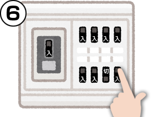 →分電盤の中の安全ブレーカーのつまみを全部下げてから、漏電ブレーカーのつまみをあげ、安全ブレーカーのつまみを、ひとつずつあげてください。